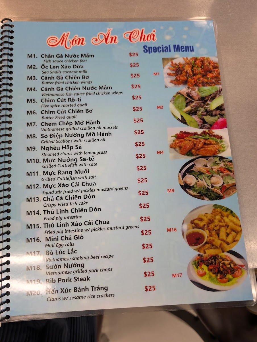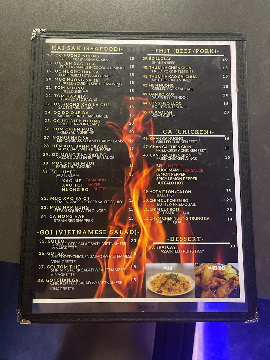 If you're in the mood for something unique, the Special Menu offers items such as Chân Gà Nước Mắm (chicken feet in fish sauce), Ốc Len Xào Dừa (snails cooked with coconut), and the crispy Cánh Gà Chiên Bơ (butter-fried chicken wings). The seafood options continue with Oc Huong Nuong (grilled sea snails), Muc Nuong Sa Te (grilled squid with satay), and Tom Hap Bia (beer-steamed shrimp), offering an authentic taste of the sea.