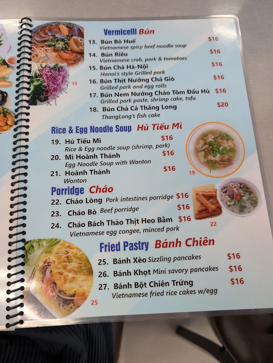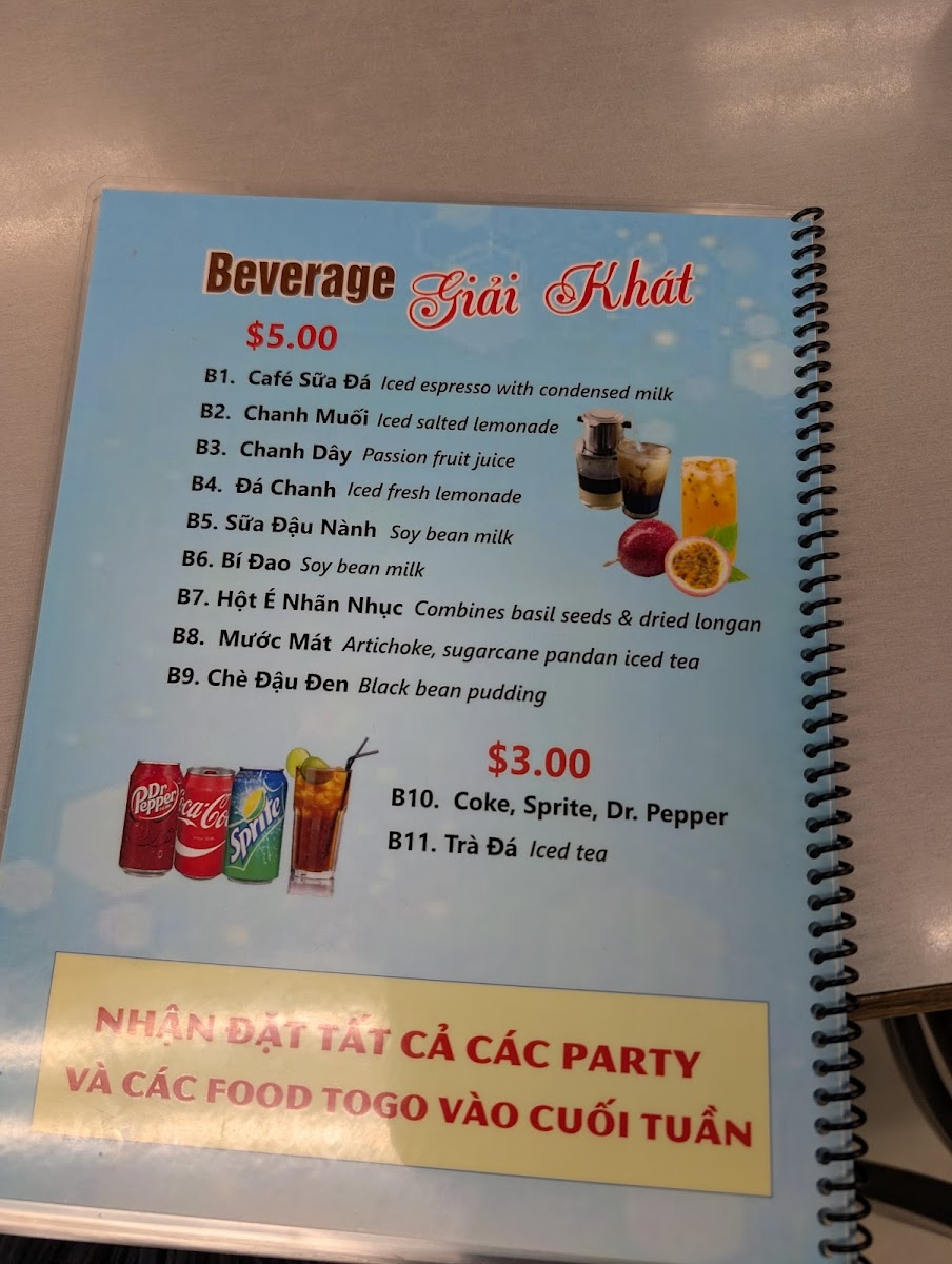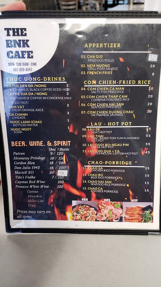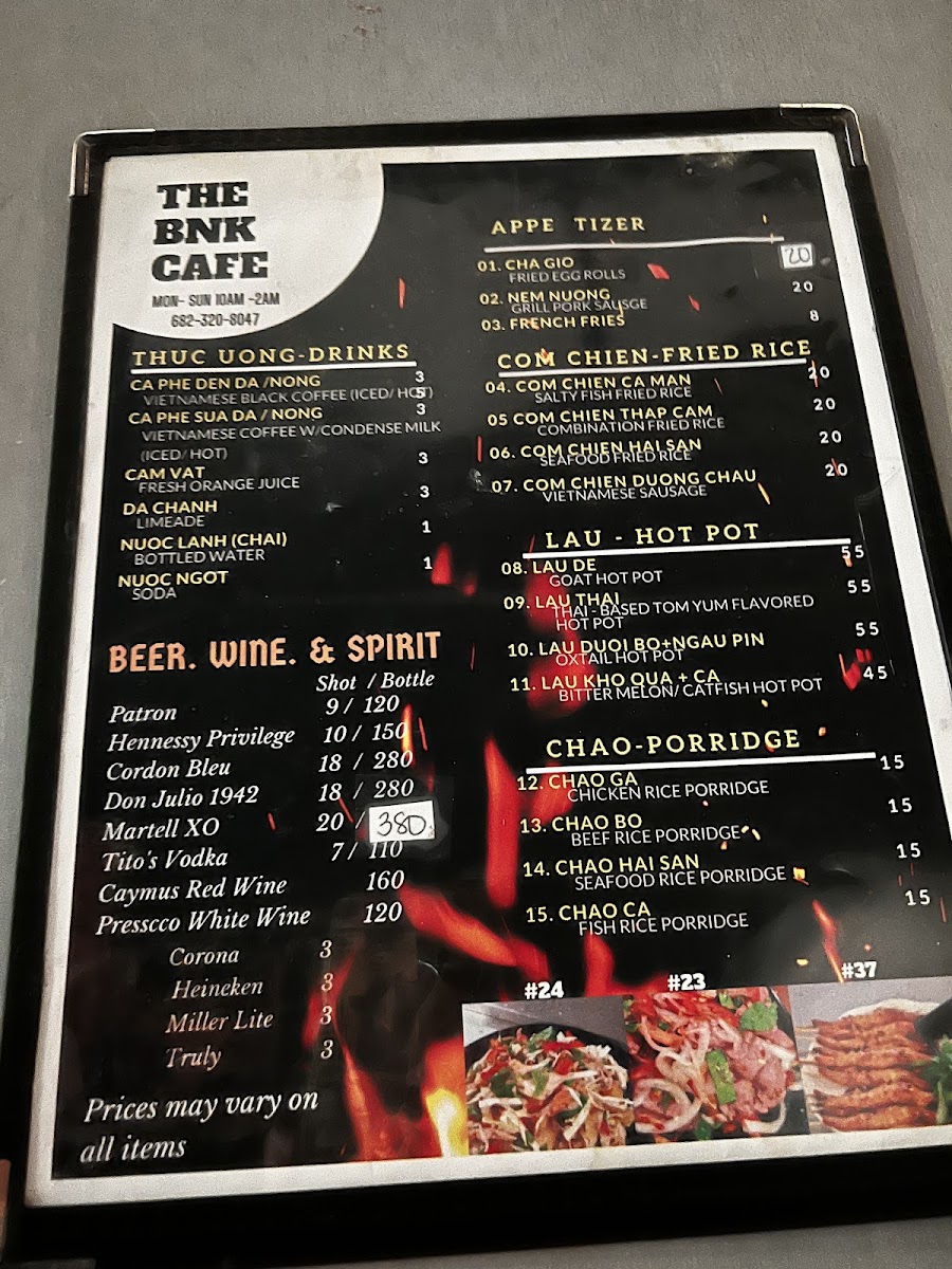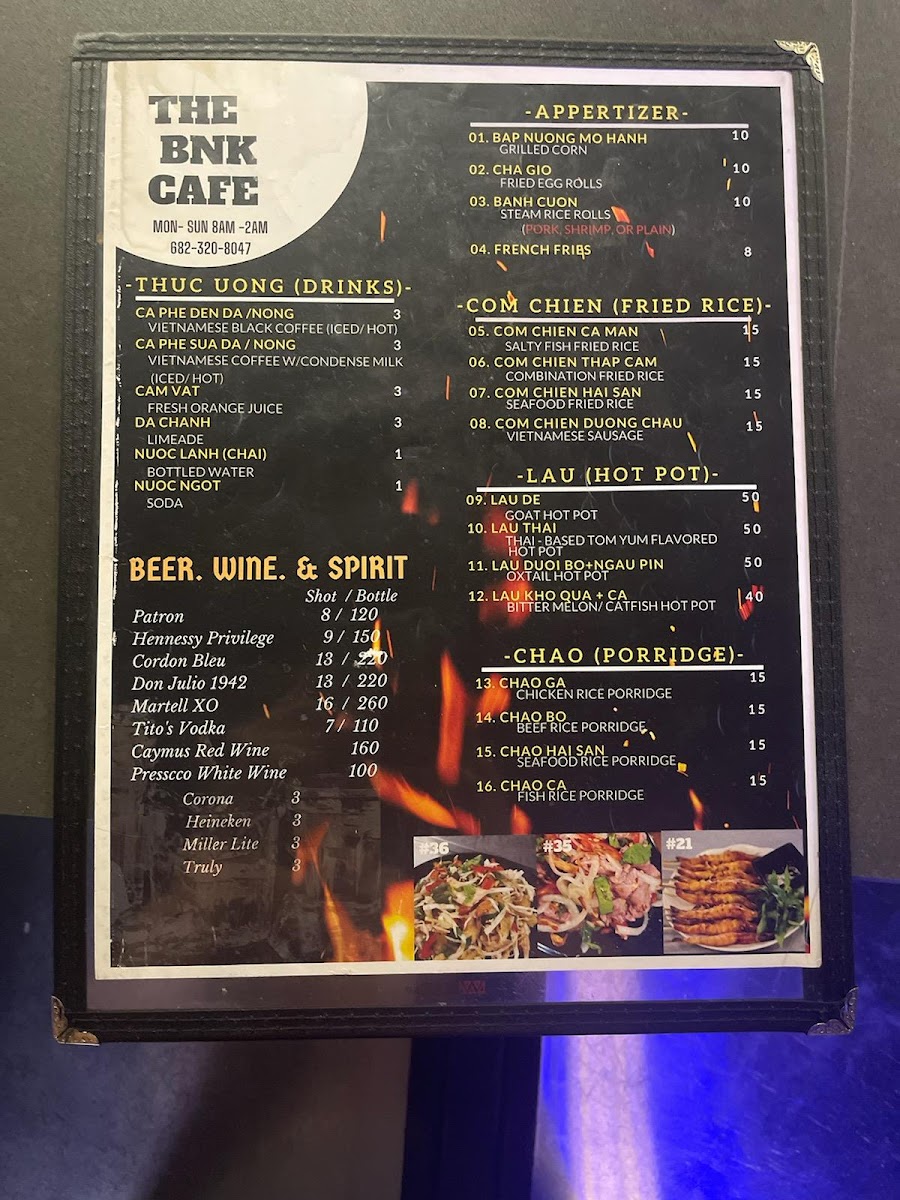 The menu at The Bnk Cafe offers a delightful array of dishes, reflecting the rich flavors of Vietnamese cuisine while also including options for different tastes and preferences. For those who appreciate traditional Vietnamese coffee, the cafe serves Ca Phe Den Da and Ca Phe Sua Da, alongside the rich and sweet Vietnamese Coffee W/Condensed Milk, perfect for coffee enthusiasts. Refreshing drinks such as Da Chanh (lemon iced tea) and Nuoc Lanh (cold water) are also available, with a selection of alcoholic beverages like Patron, Hennessy Privilege, and Cordon Bleu Don Julio 1942 for those seeking a more indulgent experience.