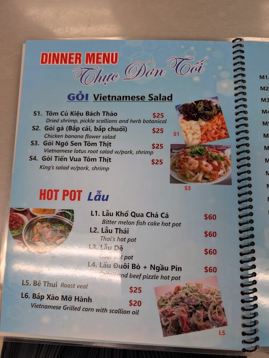 For a flavorful and hearty experience, the cafe's hot pot options, like Lau De (goat hot pot), Lau Thai (Thai-style hot pot), and Lau Kho Qua + CaRap Sour Beef Salad provide a unique dining experience. The Grilled Beef Salad With Vinaigrette offers a lighter yet equally satisfying dish to round off your meal.