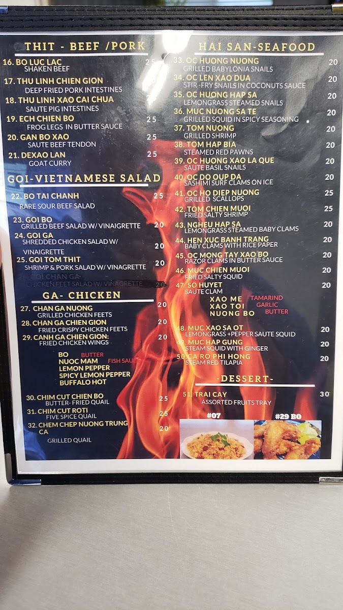 For meat lovers, there are several tempting choices such as the flavorful Shaken Beef, crispy Ech Chien Bo (fried frog legs), and savory Saute Beef Tendon. The chicken section includes Grilled Chicken Feet, crispy Chan Ga Chien Gion (fried chicken legs), and the delicious Chim Cứt Chiến Bo (fried quail with beef). Seafood enthusiasts can indulge in dishes like Tom Nuong (grilled shrimp), Sashimi Surf Clams On Ice, Lemongrass Steamed Baby Clams, and Razor Clams In Butter Sauce.